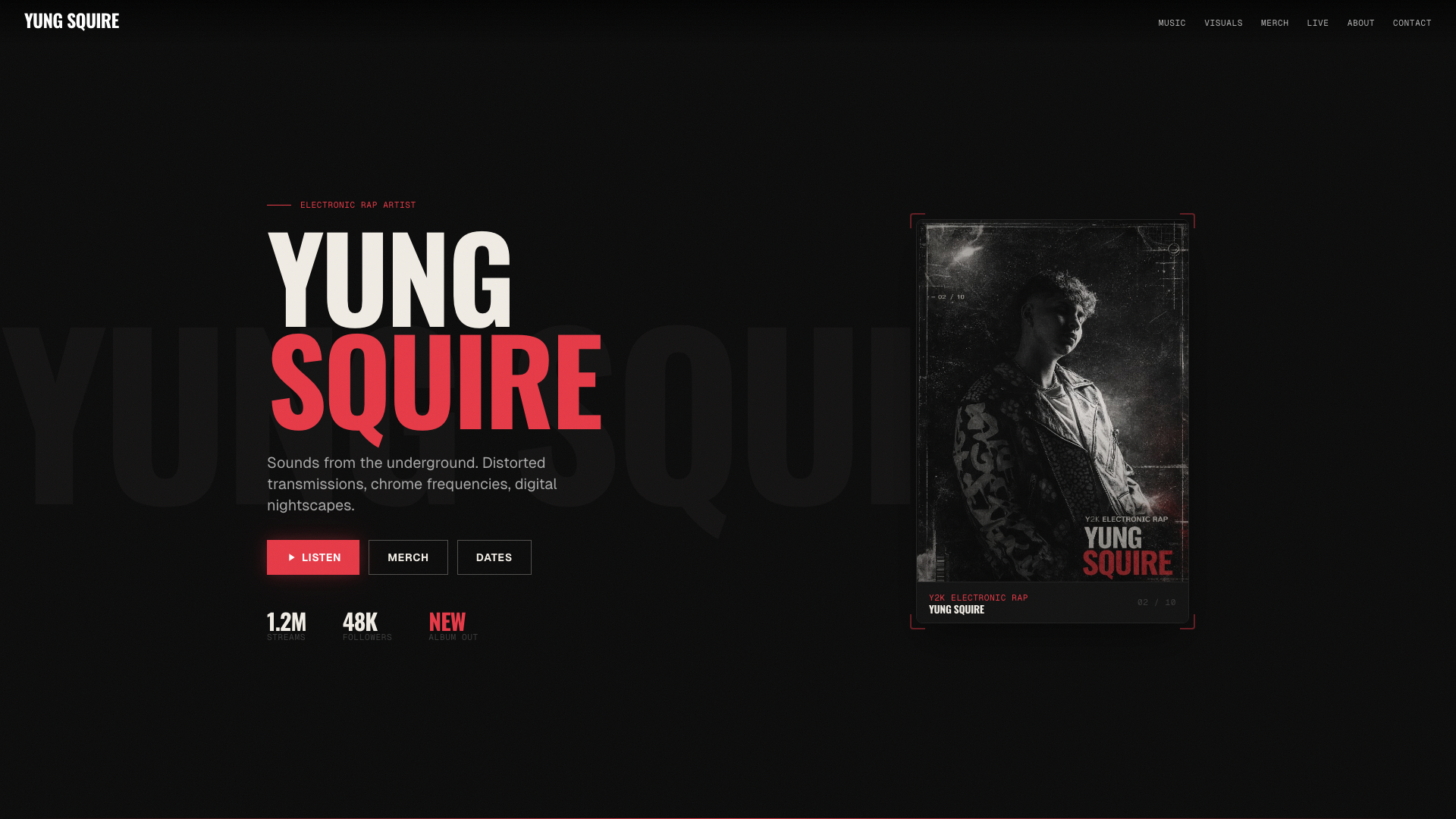 A dark, atmospheric music artist site with releases, merch store, event listings, and visual content.
