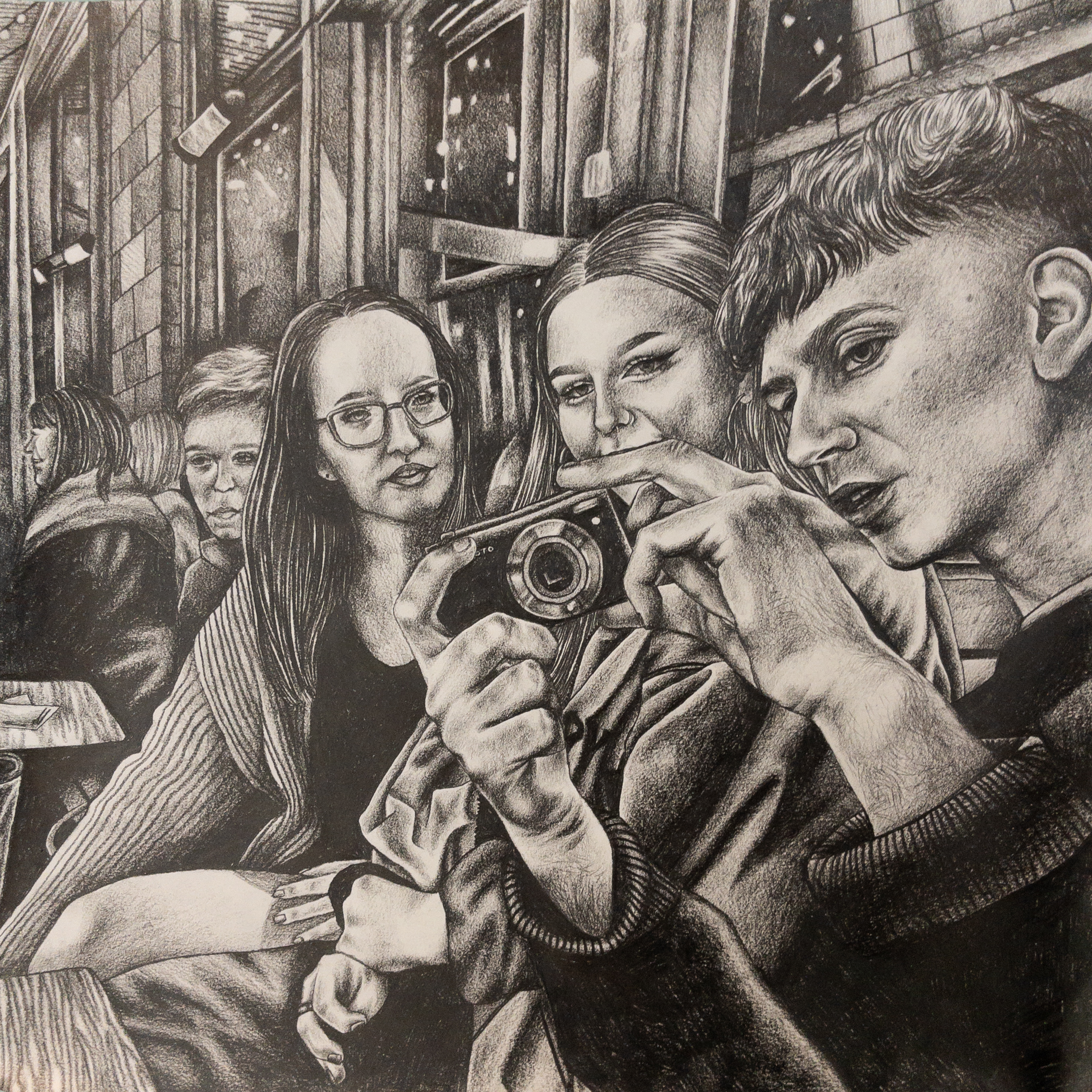 A group of friends at a bar, one holding a film camera. Crowd, warmth, and the energy of a night out captured in graphite.