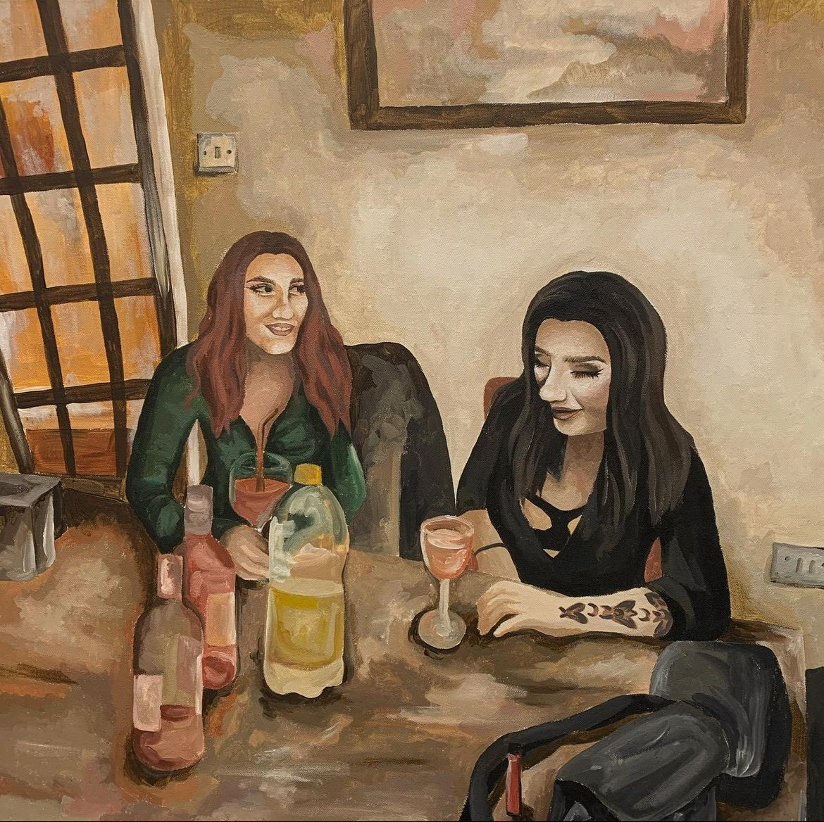 Two figures at a bar with wine bottles. Warm, muted palette capturing the ease of an evening out - a snapshot painted from life.