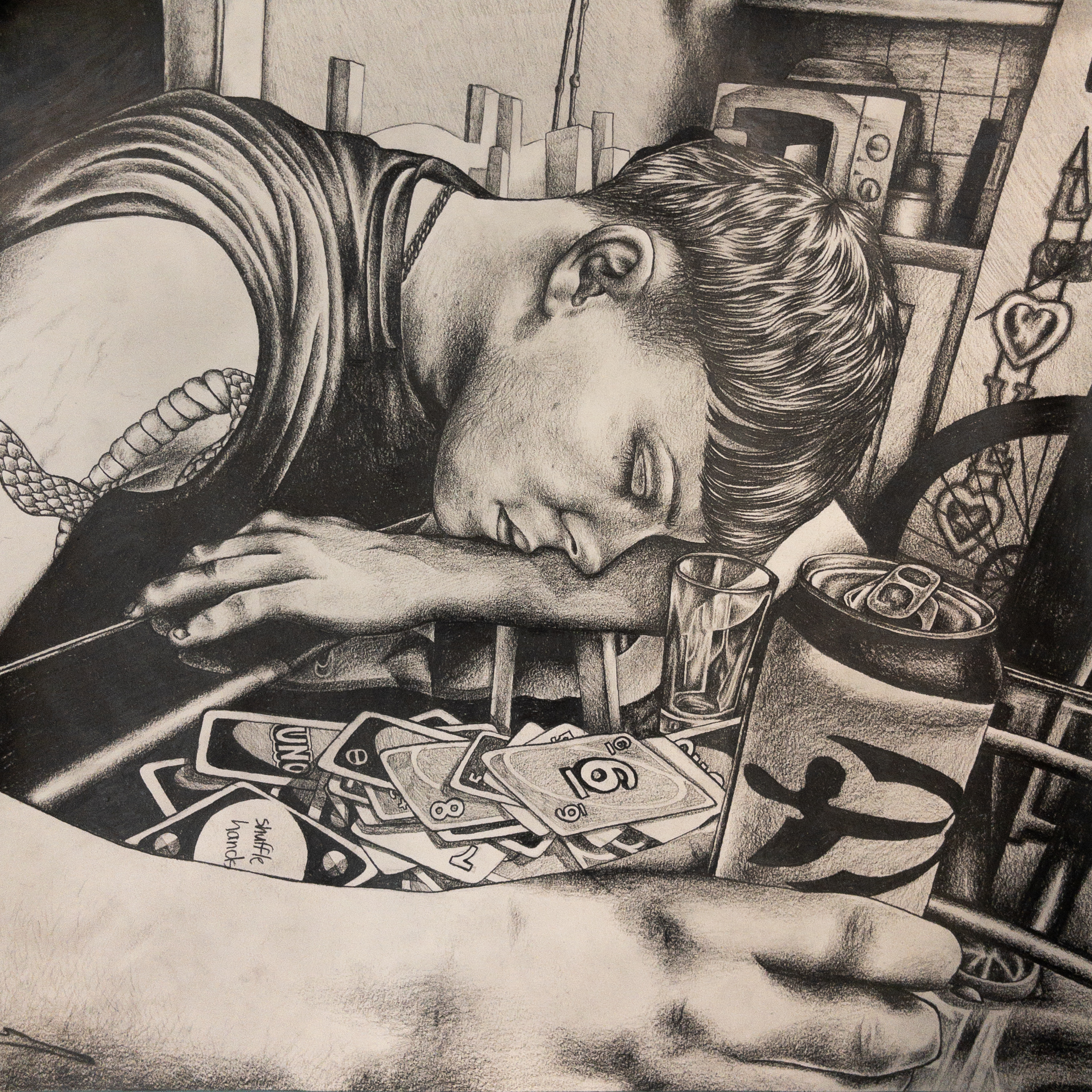 A figure resting their head on a table covered in UNO cards and drinks. A still, sleepy moment at the end of a long night.
