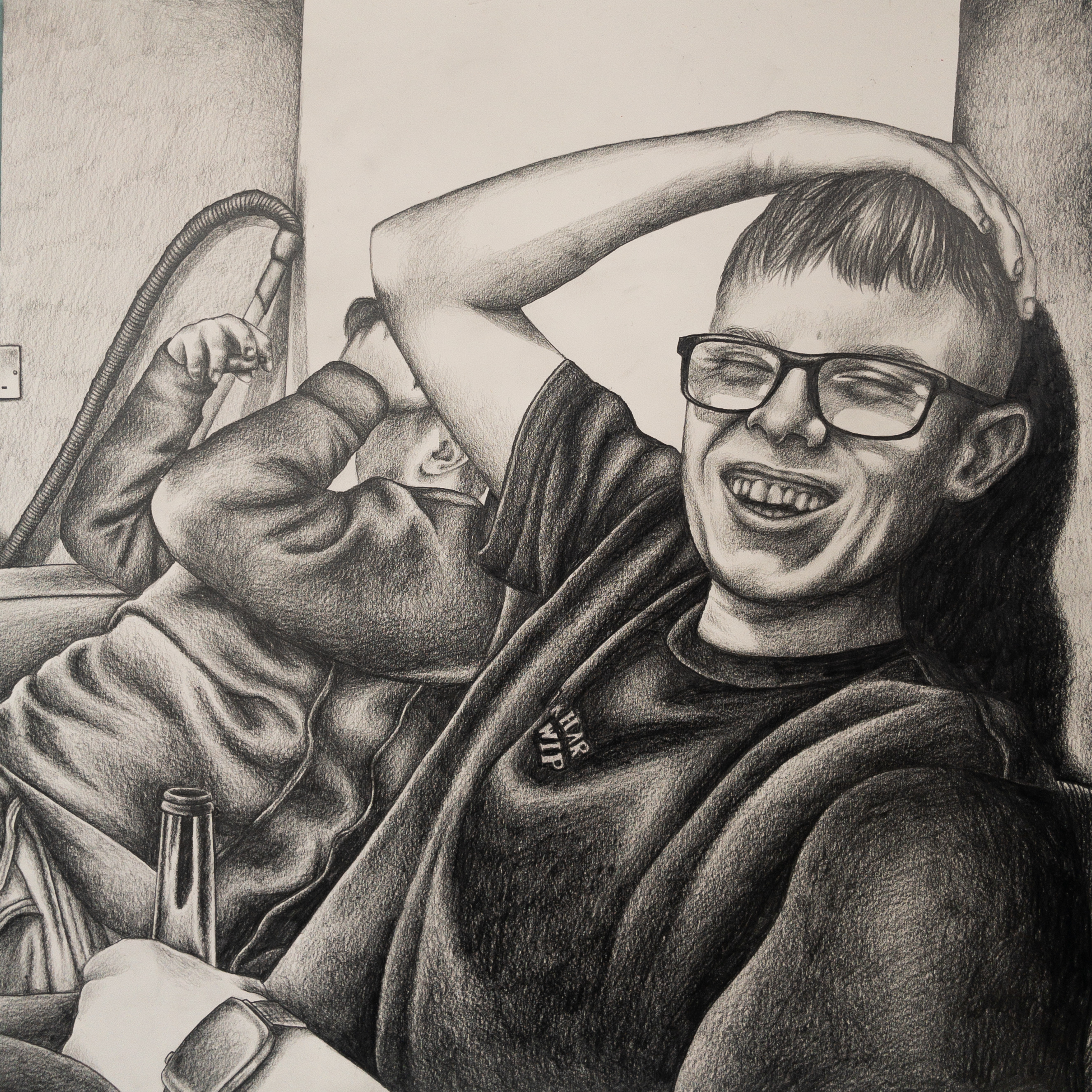 A young man laughing, leaned back with a beer. Glasses, a wide grin, and relaxed energy - a portrait of genuine happiness.